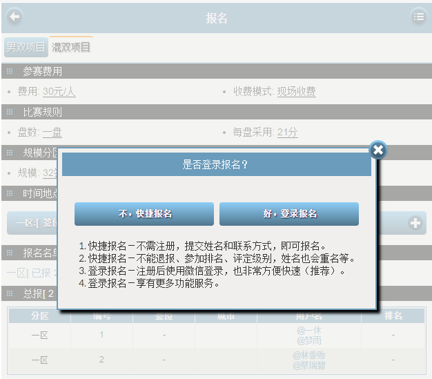 2. 快捷报名-不能退报、参加排名、评定级别,姓名也会重名等。